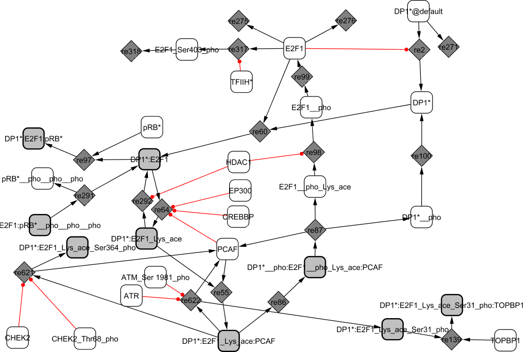 ATM_Ser 1981_pho DP1*:E2F1_Lys_ace_Ser31_pho DP1*:E2F1_Lys_ace:PCAF re318 TFIIH* E2F1_Ser403_pho re317 re292 pRB*__pho__pho__pho re291 DP1*:E2F1:pRB*__pho__pho__pho re276 re275 re271 DP1*:E2F1_Lys_ace_Ser31_pho:TOPBP1 TOPBP1 re139 re100 re99 HDAC1 E2F1__pho re98 DP1*:E2F1:pRB* pRB* re97 DP1*__pho E2F1__pho_Lys_ace re87 DP1*__pho:E2F1__pho_Lys_ace:PCAF re86 CREBBP EP300 re64 DP1*:E2F1 re60 PCAF re55 DP1*:E2F1_Lys_ace E2F1 DP1* re2 DP1*@default CHEK2 CHEK2_Thr68_pho ATR DP1*:E2F1_Lys_ace_Ser364_pho re621 re622