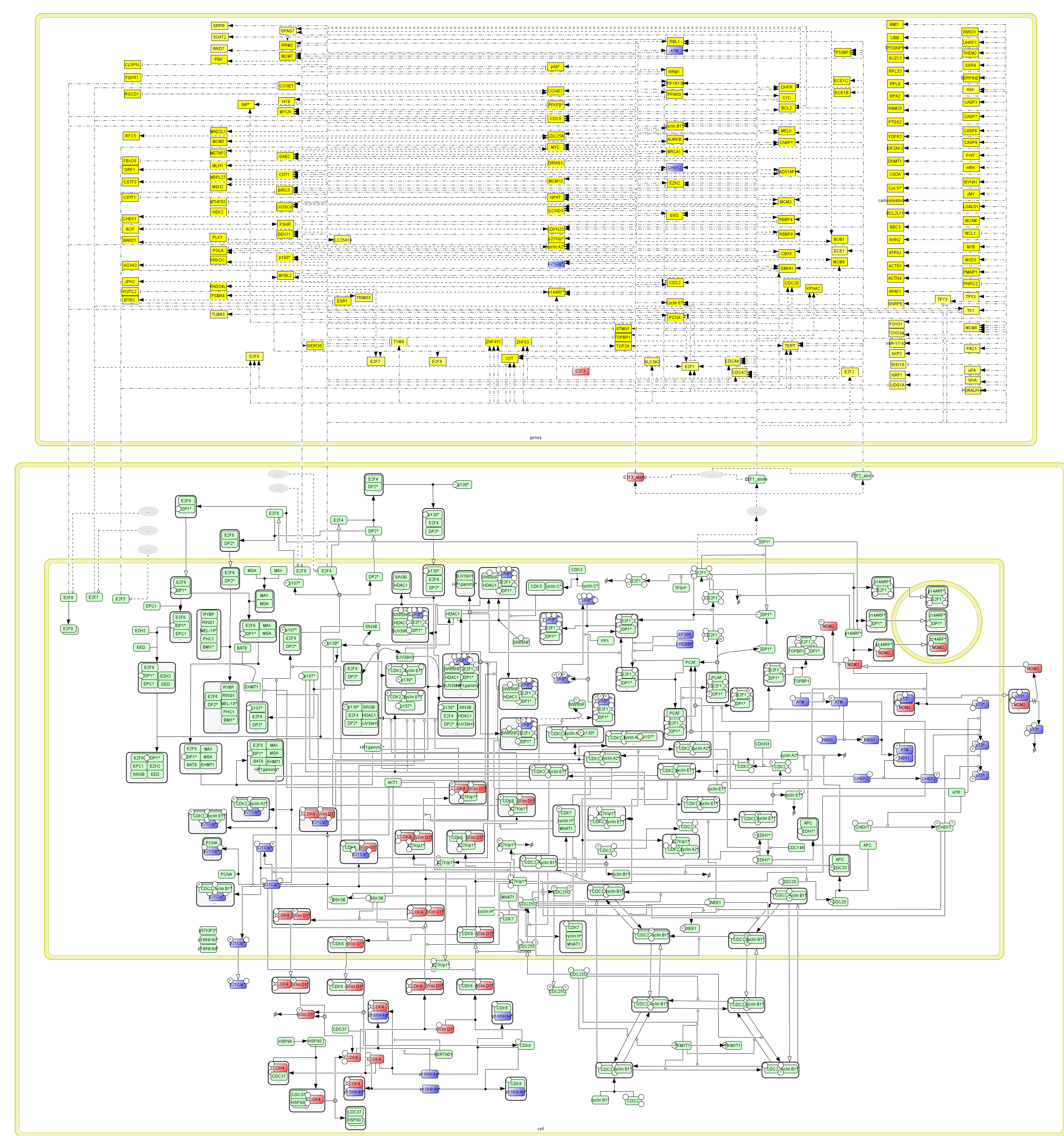 DP2*:E2F4:p107*@nucleus - CDK6__pho:cyclin D1*:p27Kip1*@nucleus - CDK4__pho:cyclin D1*:p27Kip1*@nucleus - CDK4:cyclin D1*:p21Cip*@nucleus - CDK6:cyclin D1*:p21Cip*@nucleus - CDK6__pho:cyclin D1*:p27Kip1*@nucleus -> DP2*:E2F4:p107*__pho@nucleus DP2*:E2F4:p107*__pho@nucleus -> p107*__pho@nucleus+DP2*@nucleus+E2F4@nucleus DP2*:E2F4:p107*__pho@nucleus -> p107*__pho@nucleus+DP2*@nucleus+E2F4@nucleus DP2*:E2F4:p107*__pho@nucleus -> p107*__pho@nucleus+DP2*@nucleus+E2F4@nucleus E2F4@nucleus -t-> E2F4@cell DP2*:E2F4@nucleus+p107*@nucleus -> DP2*:E2F4:p107*@nucleus DP2*:E2F4@nucleus+p107*@nucleus -> DP2*:E2F4:p107*@nucleus DP2*:E2F4@nucleus+p107*@nucleus -> DP2*:E2F4:p107*@nucleus DP1*:E2F1@nucleus+pRB*@nucleus -> DP1*:E2F1:pRB*@nucleus DP1*:E2F1@nucleus+pRB*@nucleus -> DP1*:E2F1:pRB*@nucleus DP1*:E2F1@nucleus+pRB*@nucleus -> DP1*:E2F1:pRB*@nucleus DP2*@nucleus -t-> DP2*@cell E2F1__pho@nucleus -> E2F1@nucleus E2F1__pho__ace@nucleus - HDAC1@nucleus -> E2F1__pho@nucleus E2F cofactors@cell BMI1*:DP2*:E2F6:MEL-18*:PHC1:RING1:RYBP@nucleus DP1*:E2F1:SWI/SNF:pRB*__pho__pho@nucleus EED@nucleus BAT8:DP1*:E2F6:EHMT1:HP1gamma*:MAX:MGA@nucleus SWI/SNF__pho@nucleus DP1*:E2F1:HDAC1:SWI/SNF:pRB*__pho@nucleus DP1*:E2F6:MAX:MGA@nucleus CDC2__pho:cyclin B1*@nucleus BAT8:DP1*:E2F6:EHMT1:MAX:MGA@nucleus CDK2__pho__pho:cyclin E1*@nucleus ATR@nucleus gCDKN2C@genes CHEK2__pho@nucleus CDC37:HSP90_hm2@cell gCDC2@genes gp21Cip*@genes DP2*:E2F4:p107*__pho@nucleus gCCND3@genes gCyclin E*@genes DP2*:E2F4:p130*@cell -t-> DP2*:E2F4:p130*@nucleus p107*__pho@nucleus gCBX5@genes gcyclin A2*@genes gBBC3@genes MAX:MGA@nucleus gBCL2L11@genes EHMT1@nucleus BAT8@nucleus gAXIN2@genes null@nucleus DP2*:E2F4:HDAC1:SIN3B:SUV39H1:p130*@nucleus null@nucleus PKMYT1@cell DP1*:E2F1__ace@nucleus+PCAF@nucleus -> DP1*:E2F1__ace:PCAF@nucleus DP1*:E2F1__ace@nucleus+PCAF@nucleus -> DP1*:E2F1__ace:PCAF@nucleus DP1*:E2F1__ace@nucleus+PCAF@nucleus -> DP1*:E2F1__ace:PCAF@nucleus E2F1@nucleus+DP1*@nucleus -> DP1*:E2F1@nucleus E2F1@nucleus+DP1*@nucleus -> DP1*:E2F1@nucleus E2F1@nucleus+DP1*@nucleus -> DP1*:E2F1@nucleus CDC37:CDK4:HSP90_hm2@cell gMCAM@genes gMCL1@genes gGMNN@genes gISYNA1@genes gJMY@genes gLGALS1@genes gcarboxylesterase*@genes DP2*:E2F4:p107*@nucleus gCox IV*@genes gEED@genes gEZH2@genes MGA@nucleus DP1*@cell - E2F1@nucleus -t-> DP1*@nucleus MAX@nucleus HP1gamma*@nucleus CDK4@cell CDC37:CDK4__don@cell DP1*:E2F1@nucleus - EP300@nucleus - CREBBP@nucleus - PCAF@nucleus -> DP1*:E2F1__ace@nucleus gRBBP4@genes E2F8@nucleus -> E2F8_hm2@nucleus PP1@nucleus gMXD3@genes gNPAT@genes gMCM10@genes gMYB@genes gPMAIP1@genes gPNRC2@genes gp14ARF*@genes gPCNA@genes DP1*:E2F6:EED:EPC1:EZH2@nucleus gMCM3@genes CDC37@cell HSP90_hm2@cell p21Cip*@nucleus HSP90@cell gCDC20@genes gKPNA2@genes gMCM6@genes gE2F2@genes gE2F7@genes gE2F6@genes gE2F3@genes gE2F1@genes E2F1__pho@nucleus DP2*@nucleus CDK6:cyclin D1*__pho@nucleus gBUB1@genes CDK6:cyclin D1*__pho@cell gRBBP8@genes DP1*__pho:E2F1__pho__ace:PCAF@nucleus -> PCAF@nucleus+E2F1__pho__ace@nucleus+DP1*__pho@nucleus DP1*__pho:E2F1__pho__ace:PCAF@nucleus -> PCAF@nucleus+E2F1__pho__ace@nucleus+DP1*__pho@nucleus DP1*__pho:E2F1__pho__ace:PCAF@nucleus -> PCAF@nucleus+E2F1__pho__ace@nucleus+DP1*__pho@nucleus DP1*@cell+E2F6@cell -> DP1*:E2F6@cell DP1*@cell+E2F6@cell -> DP1*:E2F6@cell DP1*@cell+E2F6@cell -> DP1*:E2F6@cell CDK4:cyclin D1*__pho@cell DP1*:E2F1__ace:PCAF@nucleus - CDK2__pho:cyclin A2*@nucleus -> DP1*__pho:E2F1__pho__ace:PCAF@nucleus CDK4:cyclin D1*__pho@nucleus DP1*:E2F6:EED:EPC1:EZH2:SIN3B@nucleus CDK6:cyclin D1*@nucleus CDK4:cyclin D1*@nucleus MDM2@cell -t-> MDM2@nucleus MDM2:p53*@nucleus -t-> MDM2:p53*@cell DP1*:E2F1__ace:PCAF@nucleus - CHEK2__pho@nucleus - CHEK2@nucleus -> PCAF@nucleus+DP1*:E2F1__ace__pho@nucleus DP1*:E2F1__ace:PCAF@nucleus - CHEK2__pho@nucleus - CHEK2@nucleus -> PCAF@nucleus+DP1*:E2F1__ace__pho@nucleus DP1*:E2F1__ace:PCAF@nucleus - CHEK2__pho@nucleus - CHEK2@nucleus -> PCAF@nucleus+DP1*:E2F1__ace__pho@nucleus DP1*:E2F1__ace:PCAF@nucleus - ATR@nucleus - ATM__pho@nucleus -> DP1*:E2F1__ace__pho@nucleus+PCAF@nucleus DP1*:E2F1__ace:PCAF@nucleus - ATR@nucleus - ATM__pho@nucleus -> DP1*:E2F1__ace__pho@nucleus+PCAF@nucleus DP1*:E2F1__ace:PCAF@nucleus - ATR@nucleus - ATM__pho@nucleus -> DP1*:E2F1__ace__pho@nucleus+PCAF@nucleus CDK4__pho:cyclin D1*:p27Kip1*@nucleus CDK4:cyclin D1*:p27Kip1*@nucleus E2F6@nucleus -t-> E2F6@cell CDK6__pho:cyclin D1*:p27Kip1*@nucleus p21Cip*@nucleus - AKT1@nucleus -> p21Cip*__pho@nucleus p21Cip*__pho@nucleus -t-> p21Cip*__pho@cell CDK2:cyclin E1*:p27Kip1*@nucleus CDK6:cyclin D1*:p27Kip1*@nucleus CDK2:cyclin A2*:p27Kip1*@nucleus p27Kip1*@nucleus p27Kip1*__pho@nucleus DP2*:E2F4:HDAC1:SIN3B:SUV39H1:p130*__pho@nucleus -> p130*__pho@nucleus+HDAC1@nucleus+SIN3B@nucleus+SUV39H1@nucleus+DP2*:E2F4@nucleus DP2*:E2F4:HDAC1:SIN3B:SUV39H1:p130*__pho@nucleus -> p130*__pho@nucleus+HDAC1@nucleus+SIN3B@nucleus+SUV39H1@nucleus+DP2*:E2F4@nucleus DP2*:E2F4:HDAC1:SIN3B:SUV39H1:p130*__pho@nucleus -> p130*__pho@nucleus+HDAC1@nucleus+SIN3B@nucleus+SUV39H1@nucleus+DP2*:E2F4@nucleus DP1*:E2F1:pRB*__pho__pho__pho@nucleus -> pRB*__pho__pho__pho@nucleus+DP1*:E2F1@nucleus DP1*:E2F1:pRB*__pho__pho__pho@nucleus -> pRB*__pho__pho__pho@nucleus+DP1*:E2F1@nucleus DP1*:E2F1:pRB*__pho__pho__pho@nucleus -> pRB*__pho__pho__pho@nucleus+DP1*:E2F1@nucleus BMI1*:MEL-18*:PHC1:RING1:RYBP@nucleus+DP2*:E2F6@nucleus -> BMI1*:DP2*:E2F6:MEL-18*:PHC1:RING1:RYBP@nucleus BMI1*:MEL-18*:PHC1:RING1:RYBP@nucleus+DP2*:E2F6@nucleus -> BMI1*:DP2*:E2F6:MEL-18*:PHC1:RING1:RYBP@nucleus BMI1*:MEL-18*:PHC1:RING1:RYBP@nucleus+DP2*:E2F6@nucleus -> BMI1*:DP2*:E2F6:MEL-18*:PHC1:RING1:RYBP@nucleus DP1*:E2F1:HDAC1:SWI/SNF:pRB*__pho@nucleus - CDK6__pho:cyclin D1*:p27Kip1*@nucleus - CDK4__pho:cyclin D1*:p27Kip1*@nucleus - CDK4:cyclin D1*:p21Cip*@nucleus - CDK6:cyclin D1*:p21Cip*@nucleus -> HDAC1@nucleus+DP1*:E2F1:SWI/SNF:pRB*__pho__pho@nucleus DP1*:E2F1:HDAC1:SWI/SNF:pRB*__pho@nucleus - CDK6__pho:cyclin D1*:p27Kip1*@nucleus - CDK4__pho:cyclin