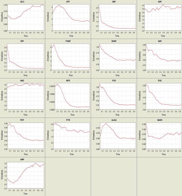 Exemplary Time Series used for the Inference Idealistic time series (100 time points) generated by JDesigner were subsequently distorted by time sampling, leaving 19 time points at random time intervals, and by adding statistical noise with the noise-to-signal level: 0.05. Click on the image to download the time series.